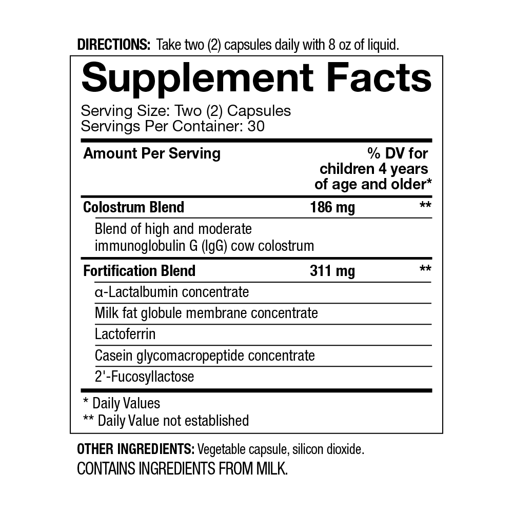 • Bovine colostrum – Maintains intestinal health and integrity and supports healthy immune system function and a healthy gut microbiome*